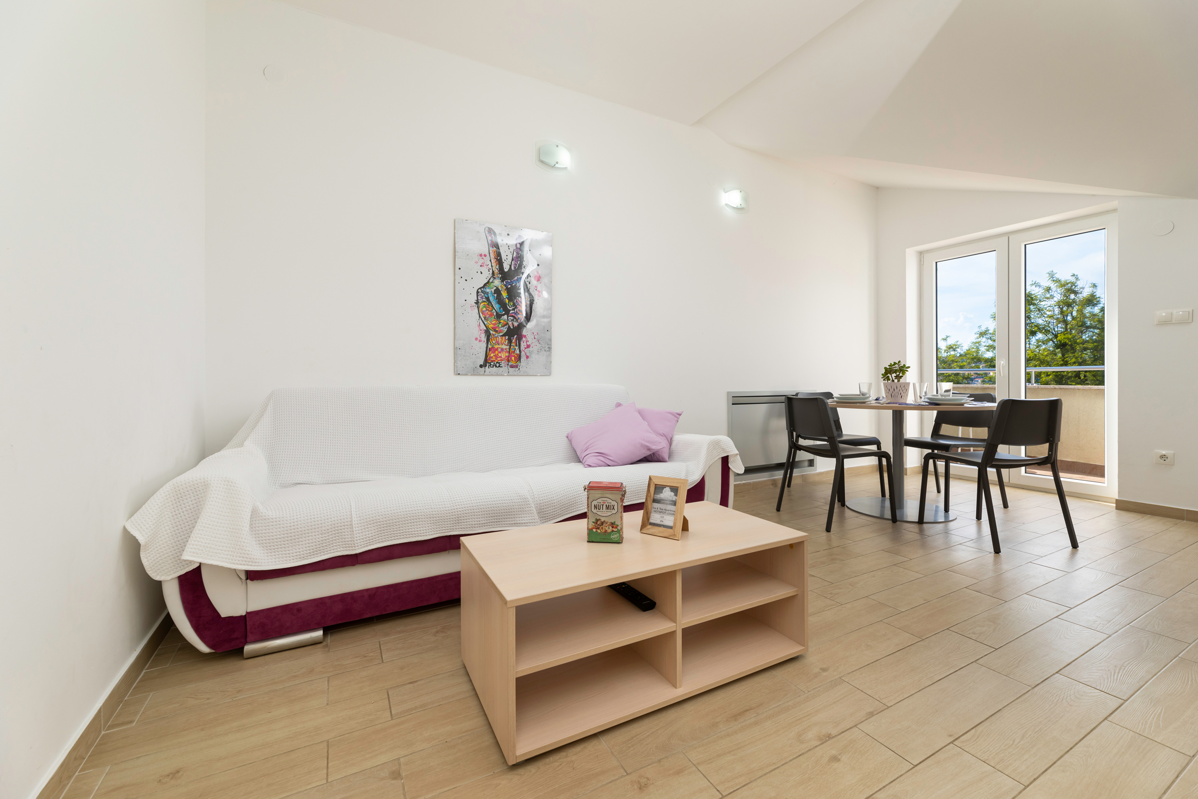 Apartment with a total size of 67 m2, consist of two bedrooms, with a private bathroom and access to the balcony from both rooms, a living room, a dining room with a kitchen and a sofa bed for one person.